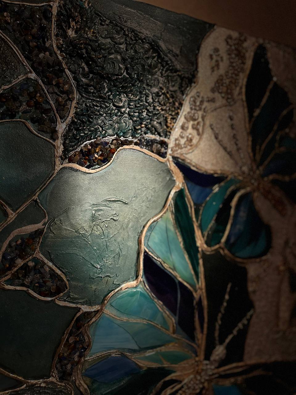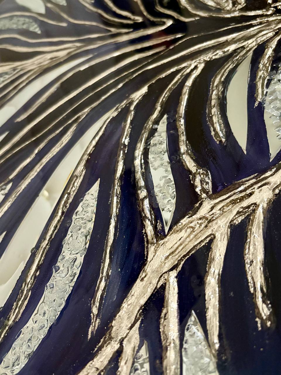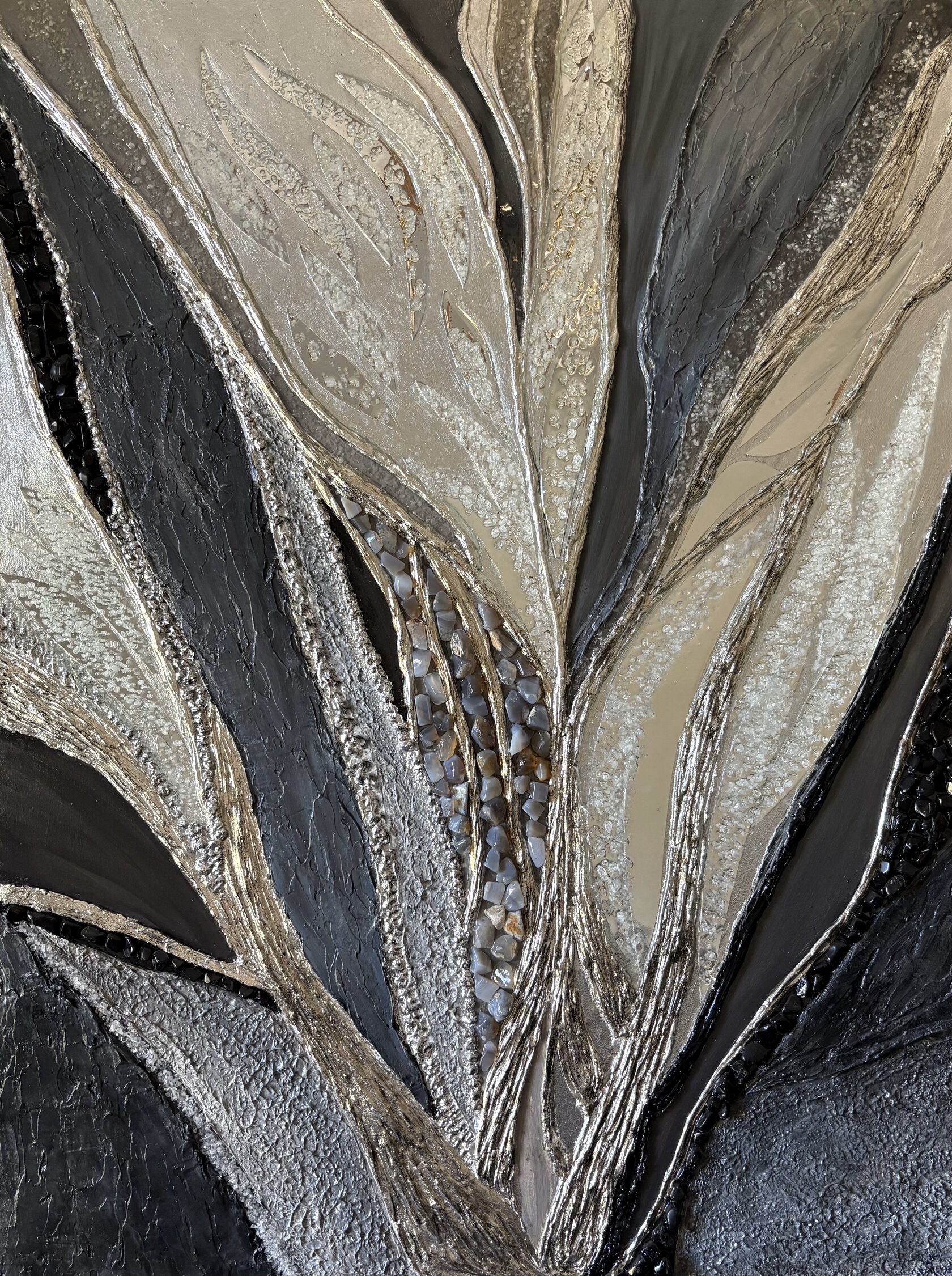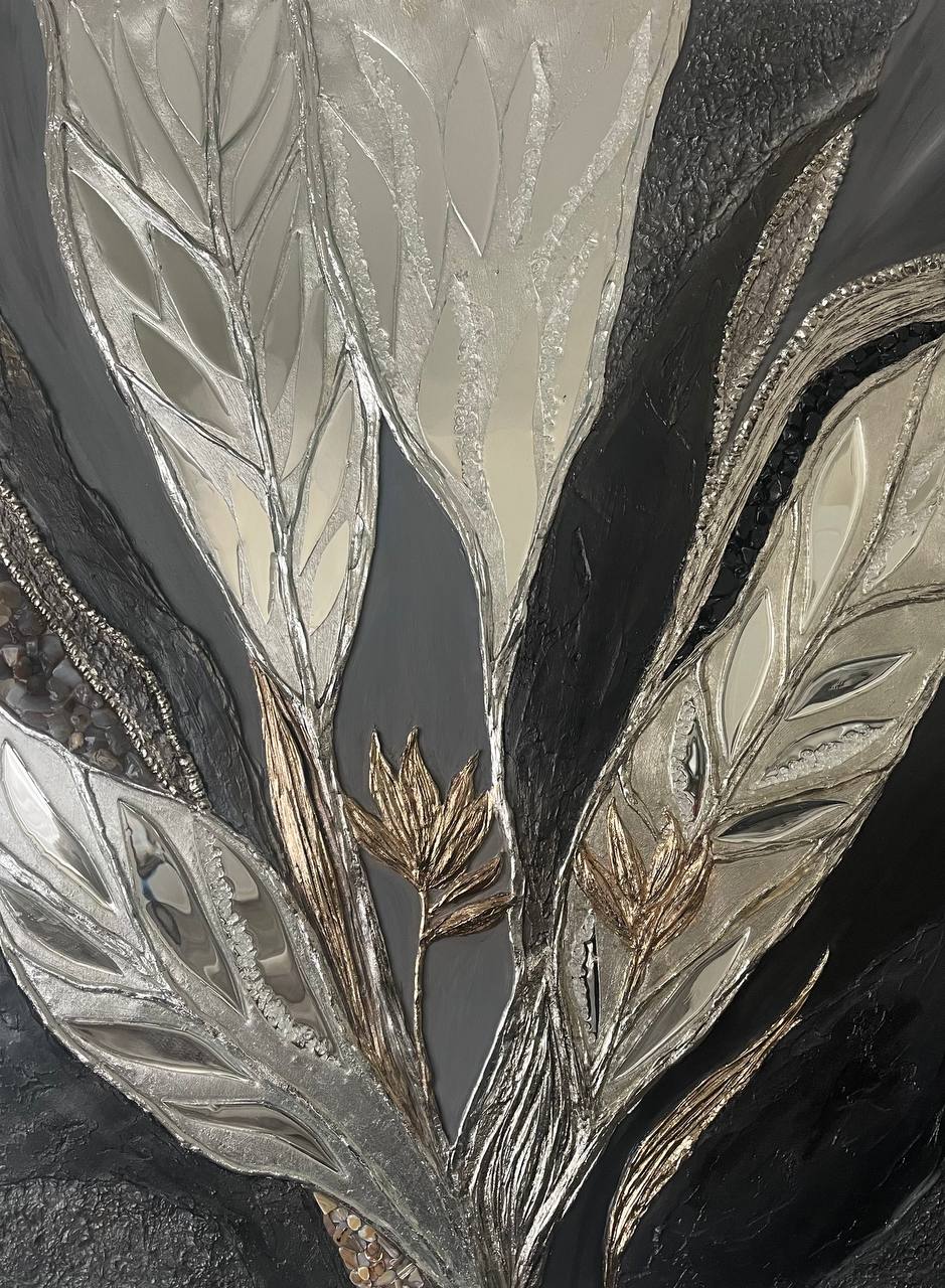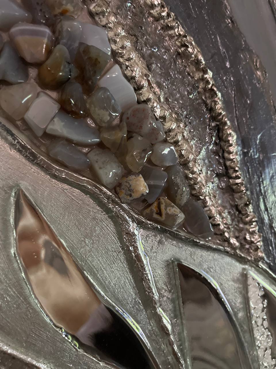 Texture paste, mosaic, acrylic paints, mirror gold leaf, natural mirrors, pure quartz, agate, epoxy resin