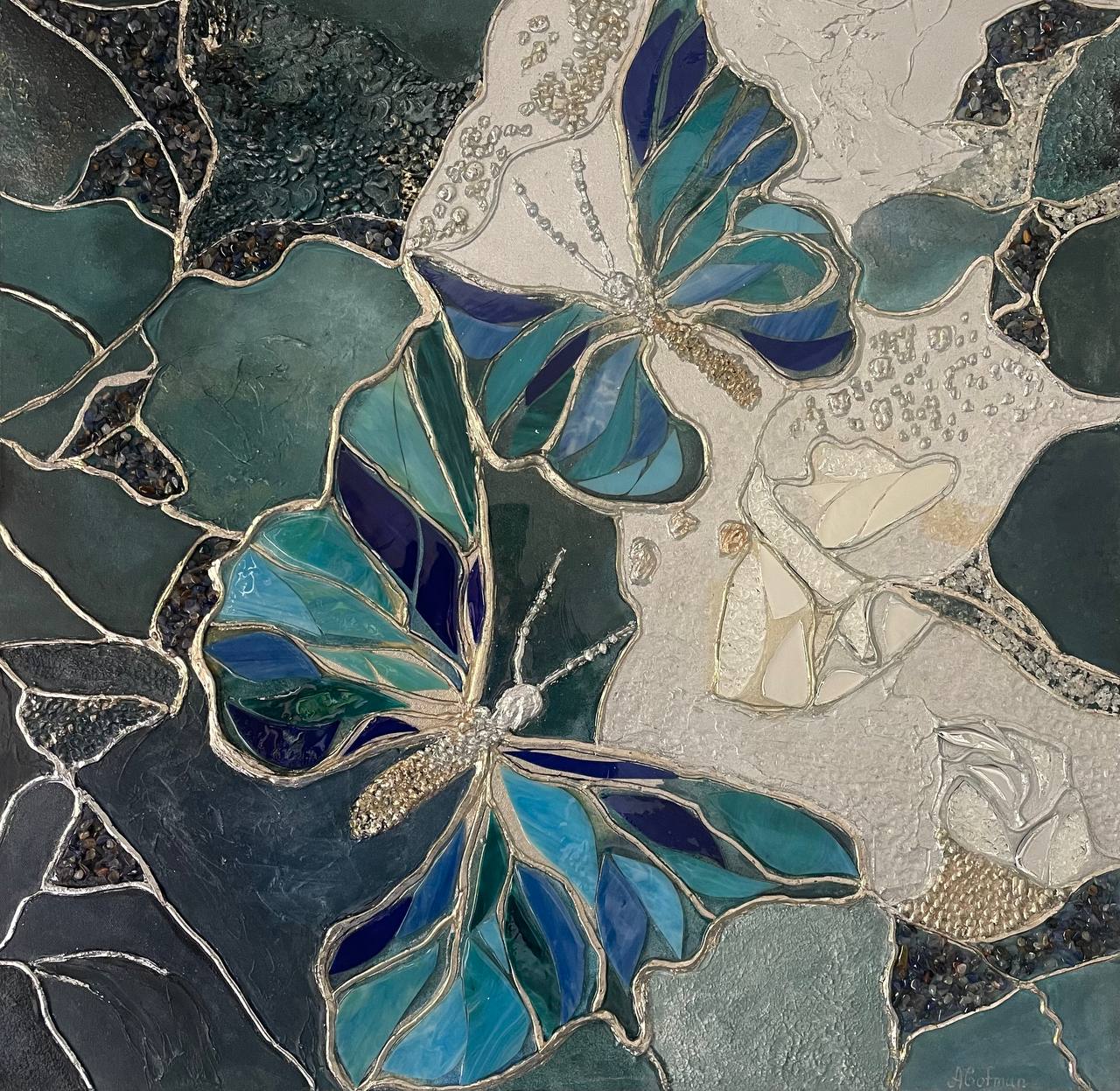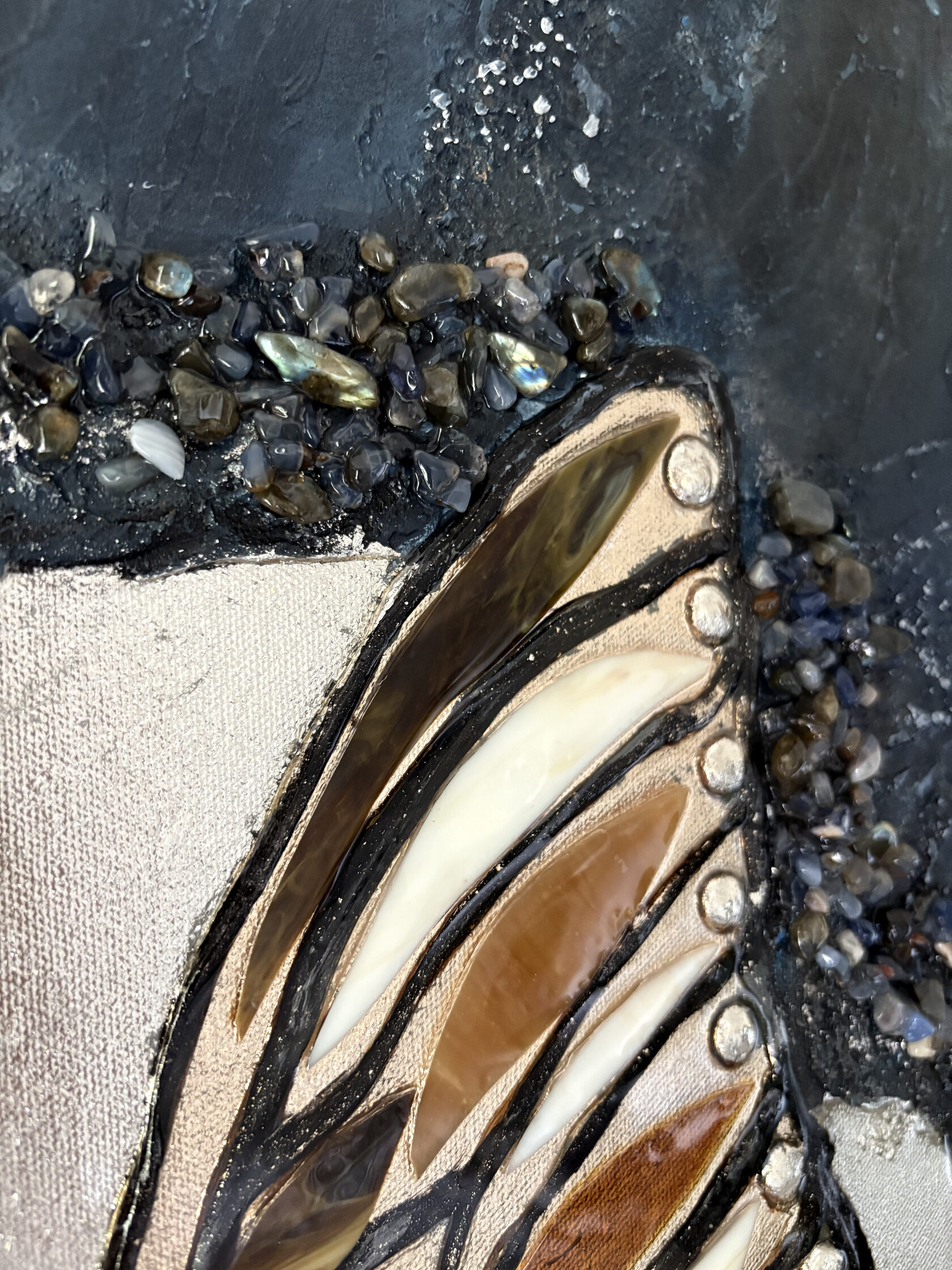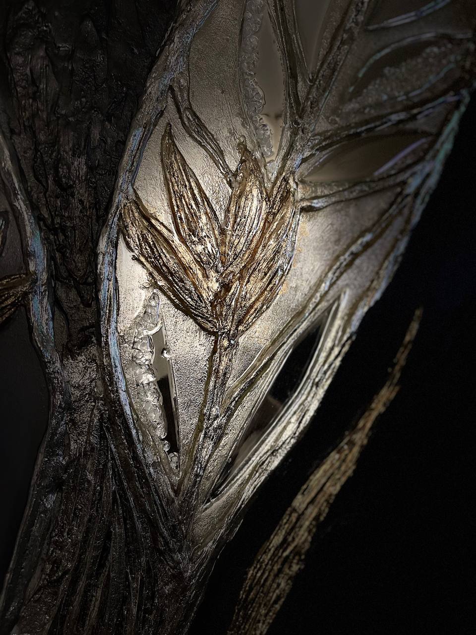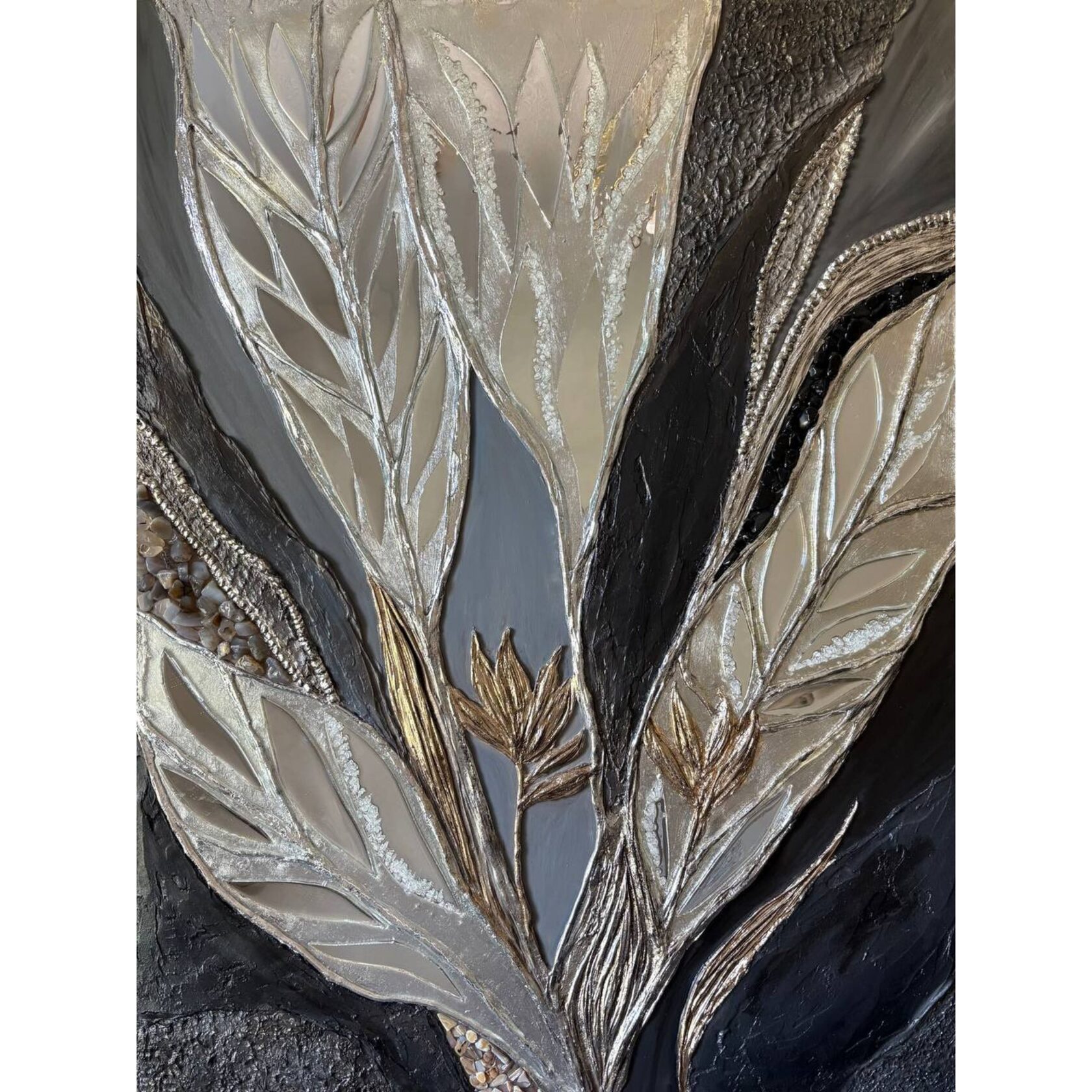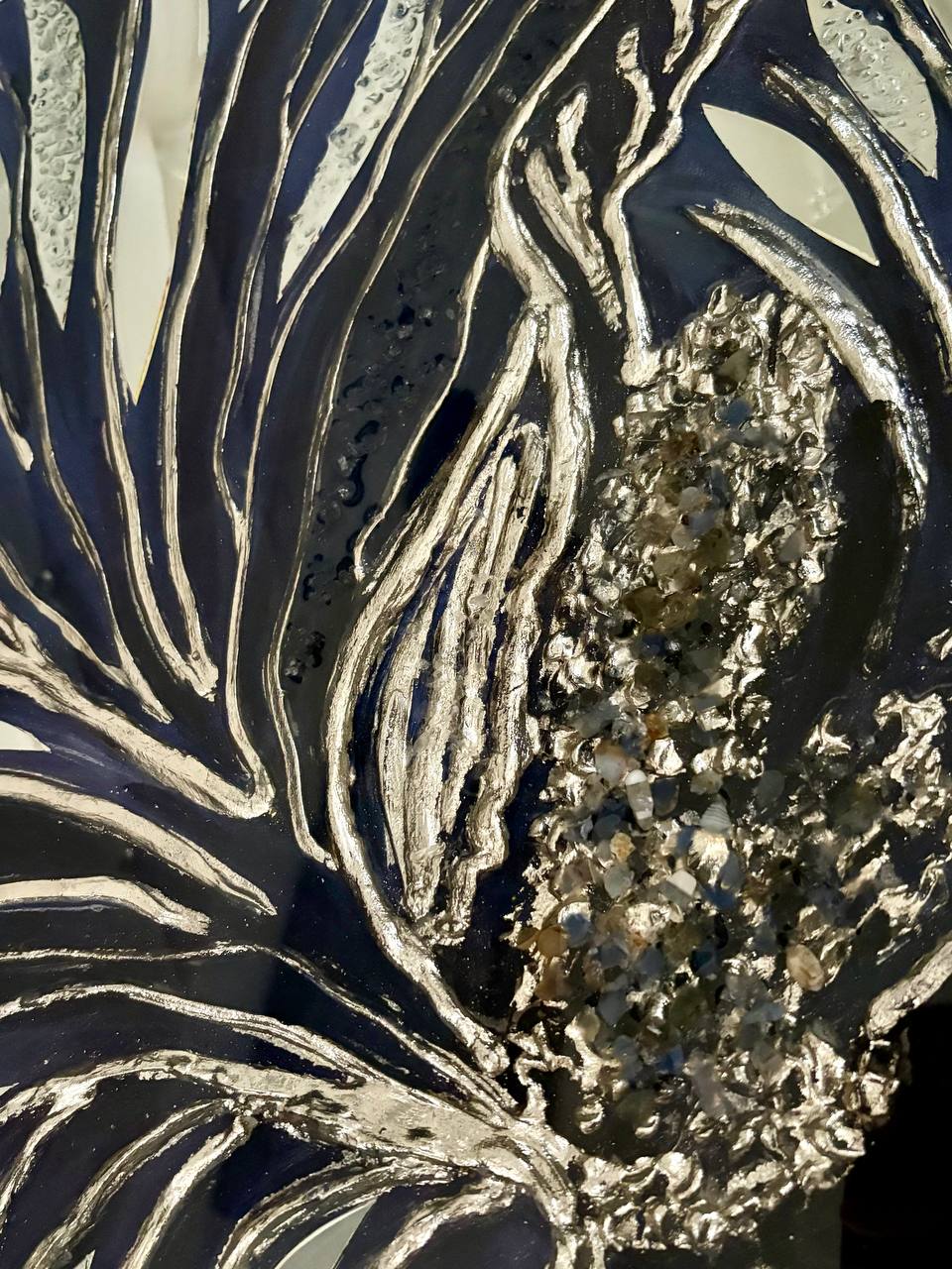 Texture paste, mosaic, acrylic paints, mirror gold leaf, natural mirrors, pure quartz, agate, epoxy resin