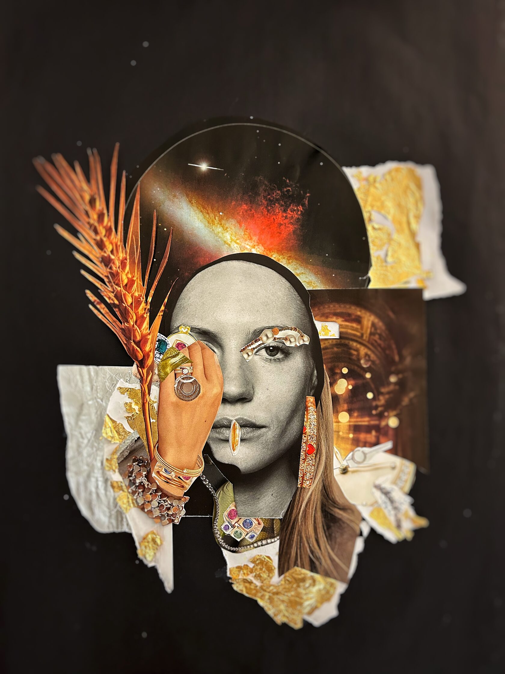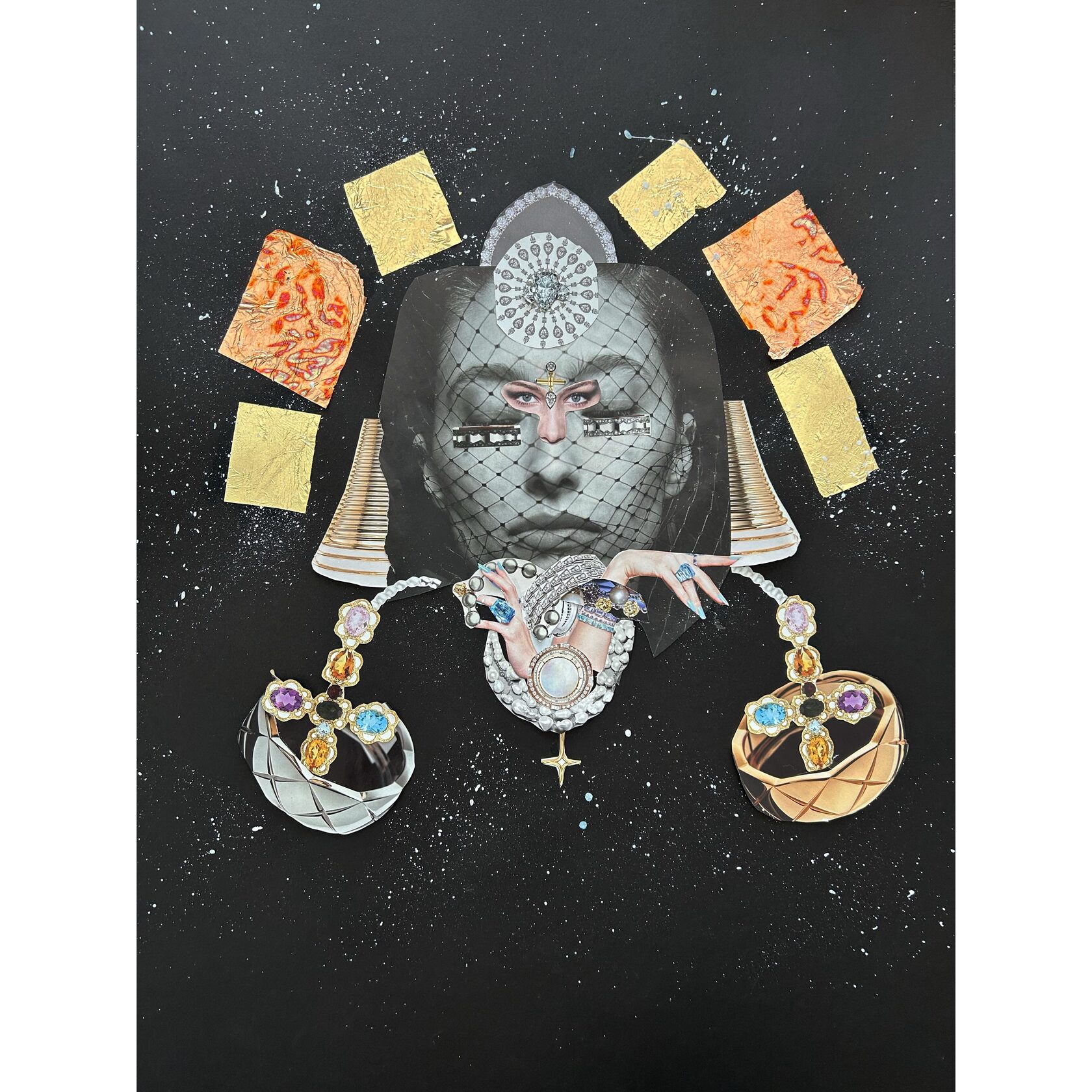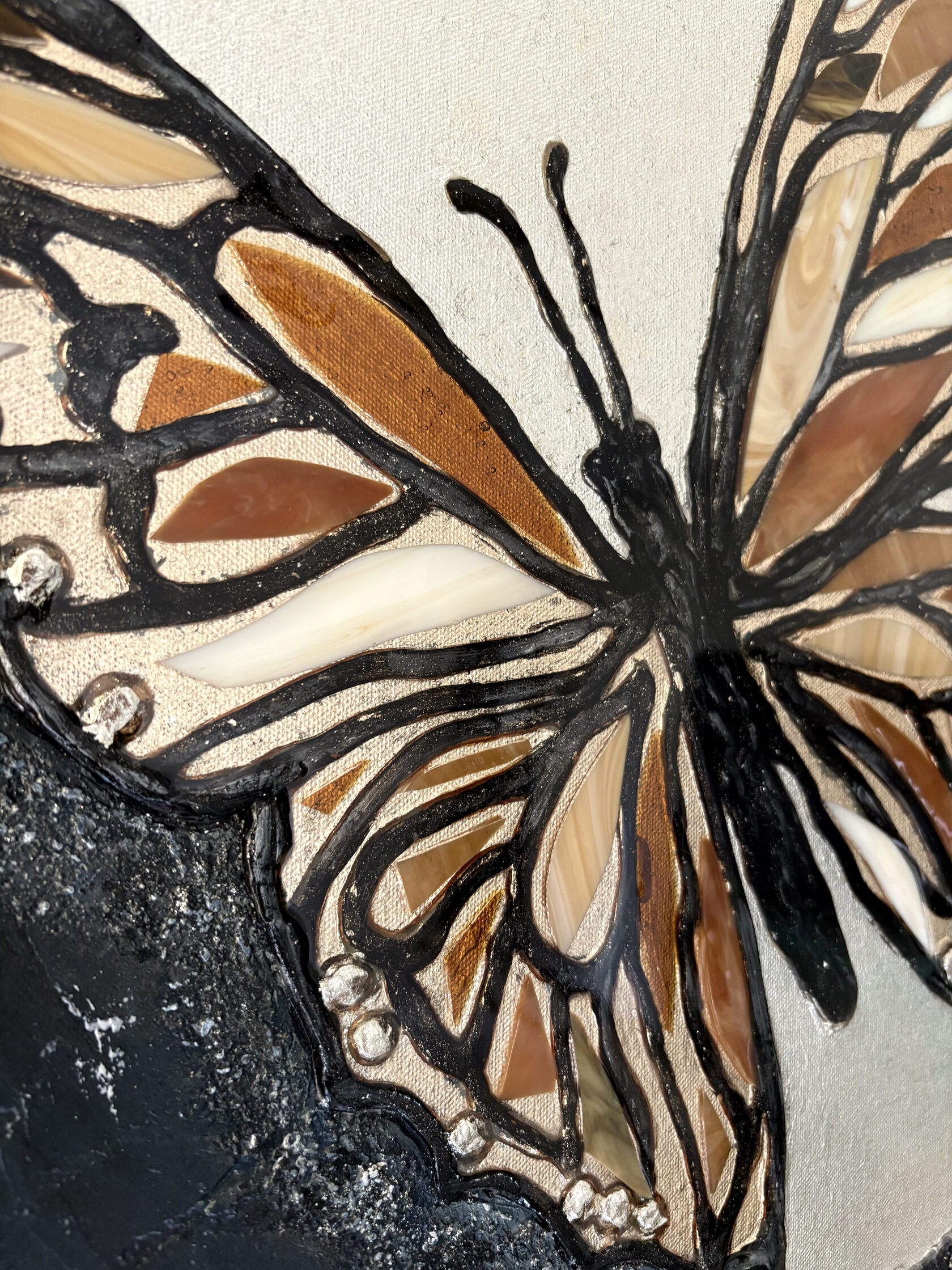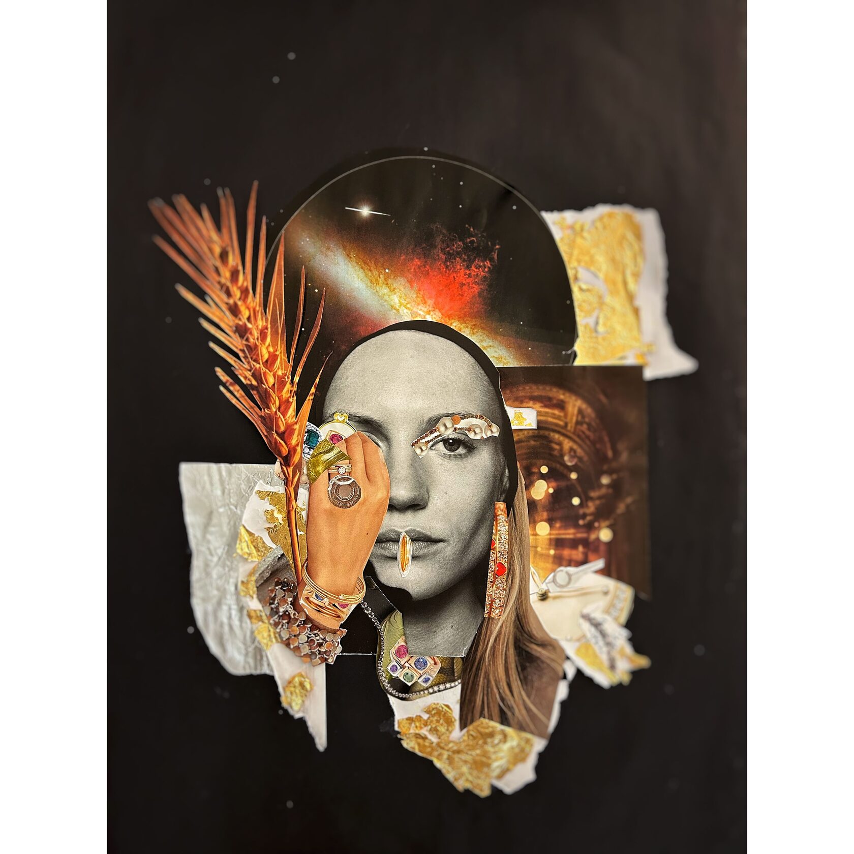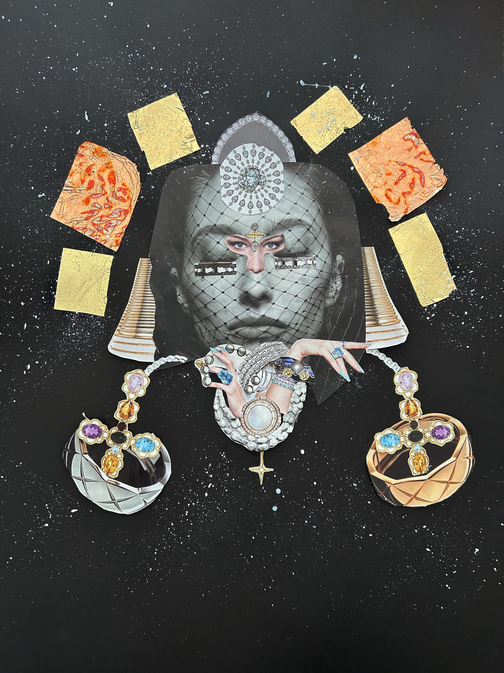 Texture paste, mosaic, acrylic paints, mirror gold leaf, natural mirrors, pure quartz, agate, epoxy resin